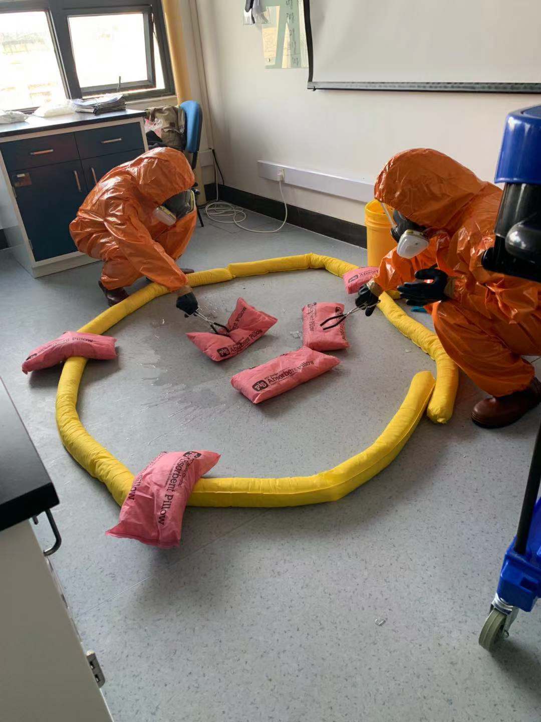 危险化学品泄漏安全处置应急演练环节在3号公司楼进行。在江苏君源环保科技有限公司安全培训讲师陈坚老师的指导主持下,以实验室发生化学品乙醚试剂瓶摔碎并飞溅到员工身上为例,演示了危险化学品泄漏后人员逃生自救、医疗救护、紧急动员、应急通讯、指挥与研判、警戒与管制、事故处置、恢复移交和调查分析等规范化应急处置动作及启动公司应急体系的过程。本次安全培训和应急演练活动由英国365集团公司副经理王富军主持,英国365集团公司和化学化工与生物工程公司部分师生参加培训,英国365集团公司部分师生、资产管理处、保卫处等联合演练。