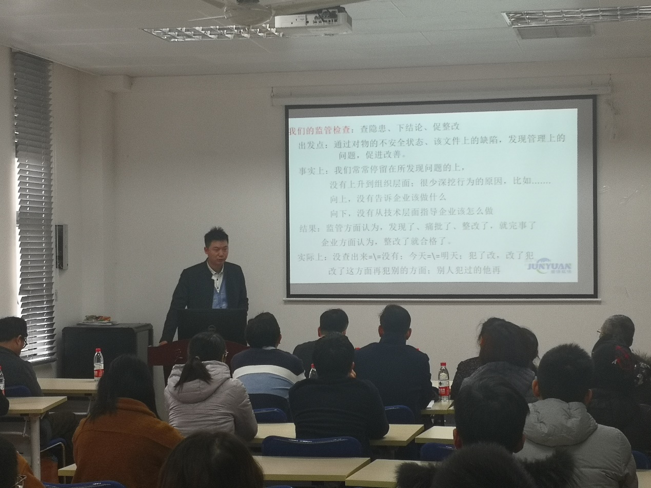 培训会上,江苏君源环保科技有限公司安全培训讲师屈俊勋通过大量的事故案例阐述了实验室应急体系建设的重要性,详细介绍了应急体系建设的关键要素、常用应急用品配备和使用方法、应急演练的流程和注意事项等内容。
