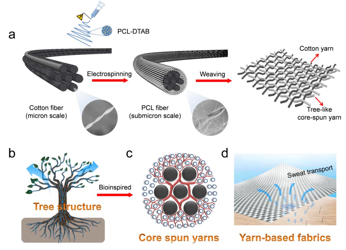 此外,该团队受自然界中水分在树木中传递的启发,制备了静电纺纳米纤维-棉纤维复合纱线,该纱线内部具有树杈型梯度的水分传递通道,在纱体内部产生差动毛细效应,实现水分在纱线径向中的快速传输(图3)。因此由该种纱线制成的织物能够有效地将人体表面的水分转移到服装外层,再通过外层强烈的蒸发效应,实现快速干燥,保持“人体-服装”微环境的舒适。该研究通过控制十二烷基三甲基溴化铵(DTAB)的含量实现对聚己内酯(PCL)纳米纤维的润湿性能进行准确的控制,进而使纱线获得最优的水分管理性能,制备的织物可以获得1034.5%的单向传递指标和0.88的综合水分管理能力,该值可以比肩目前最先进的单向导水膜。该种纱线因其良好的水分管理性能,为吸湿排汗纺织品的结构设计提供了一种新的思路,可用于传统服装和功能服装等领域。相关成果以《用于吸湿排汗的润湿性可控的树形结构一维纤维集合体》(Wettability Control in Tree Structure-Based 1D Fiber Assemblies for Moisture Wicking Functionality)为题,发表在著名期刊《ACS Applied Materials & Interfaces》。该论文第一作者为英国365集团公司博士生毛宁,英国365集团公司为唯一署名单位。