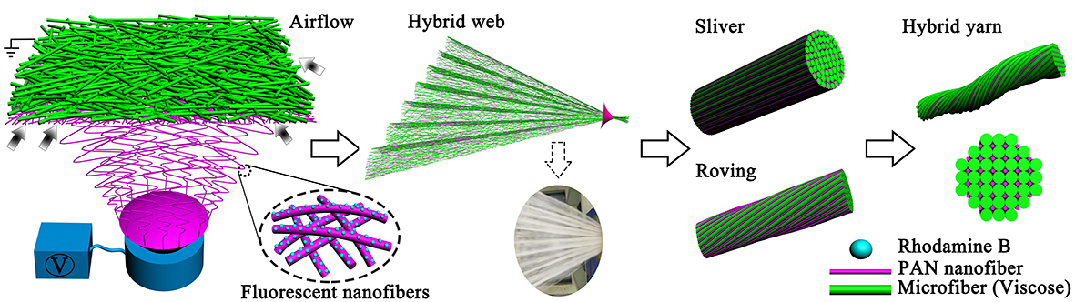 近日,该团队提出了将静电纺丝与传统纺纱技术相结合,通过纳米纤维与短纤棉网在线复合高效可控制备微纳米纤维跨尺度复合纱线的新策略——电离镶嵌纺(图1)。研究团队以自主设计开发的产业化自由液面静电纺丝装置为基础,通过在纤维梳理阶段,将宏量制备的PAN纳米纤维在线均匀沉积在二维蓬松的短纤棉网上,实现多尺度纤维集合体的高概率均匀复合,最终制备出纳米纤维片段长度可控并均匀分布的新型复合纱线。该方法的提出为多尺度纤维集合体的结构设计和高效制备提供了新的思路,同时也为微纳米纤维复合纱线的功能化、规模化应用提供了一种可行策略。相关成果以《微纳米纤维复合纱线的高效制备策略》(An efficient hybrid strategy for composite yarns of micro-/nano-fibers)为题,发表在SCI期刊《Materials & Design》。论文第一作者为英国365集团公司博士生杨雨晨,英国365集团公司为唯一署名单位。