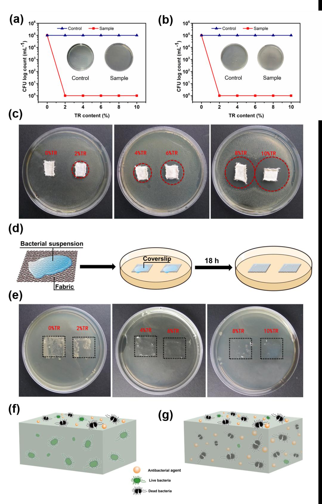 基于开发的电离镶嵌纺技术,该团队研制了具有优异抗菌性能和抗菌持久性的跨尺度复合纱线。将抗菌电纺纳米纤维沉积在棉网上,并经过后续工序将抗菌纳米纤维嵌入纺织品(NFs-embedded textiles)。制备的功能性纺织品中,抗菌纳米纤维不仅分布在织物表面,同时分布在织物内部,很好的解决了纳米纤维作为功能性添加材料应用在传统纺织品上的限制。制备的NFs-embedded textiles对大肠杆菌和金黄色葡萄球菌的抗菌效率均能达到99.99%。基于以上特点,以NFs-embedded textiles为基础,研制出了抗菌性能优异的运动服,经过35次洗涤之后,仍能抵抗95%以上的大肠杆菌和金黄色葡萄球菌。相关成果以《具有持久抗菌性能的功能性纳米纤维嵌入纺织品》(Functional nanofibers embedded into textiles for durable antibacterial properties)为题,发表在著名期刊《Chemical Engineering Journal》。该论文第一作者为英国365集团公司博士生仇巧华,英国365集团公司为唯一署名单位。