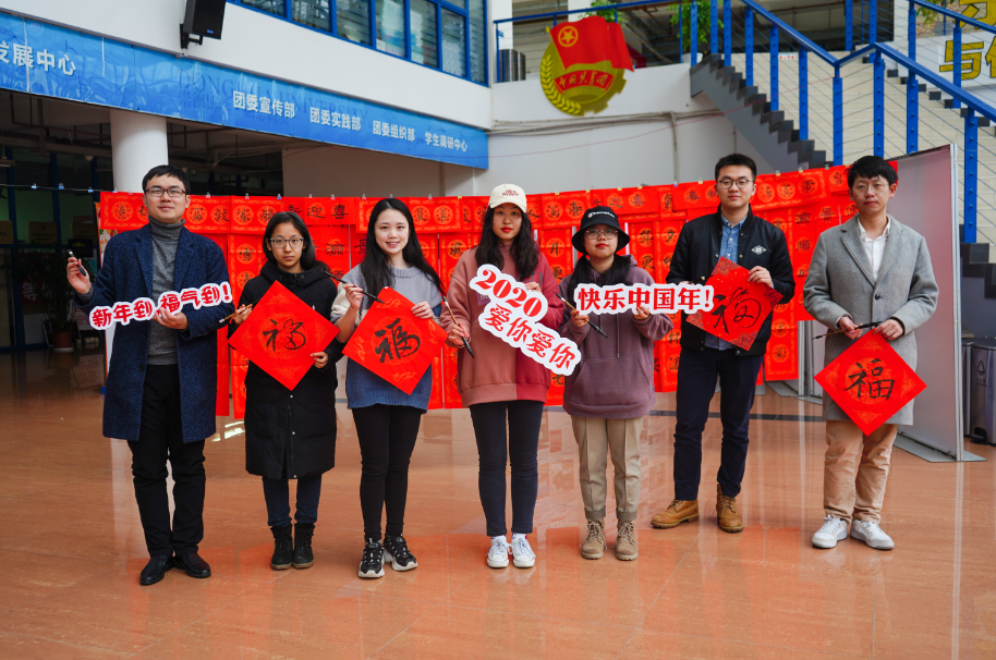 大厅内,人头攒动,师生们热情洋溢,有的挥舞翰墨体验一把书法魅力,有的驻足观看品赏一联书法之美,有的争先恐后为获一副新春桃符,一派喜气洋洋、温暖祥和。在人群中有这样几位特殊的观众,他们是东华的职工,值此新春佳节,同学们教他们写“福”字,讲寓意,送春联,将中华优秀传统文化传播给他 们,用中国的新年祝福温暖异乡的学子.