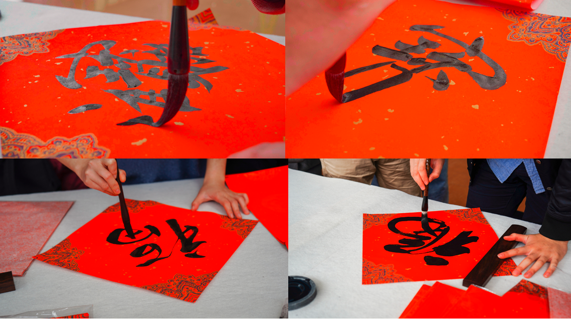 大厅内,人头攒动,师生们热情洋溢,有的挥舞翰墨体验一把书法魅力,有的驻足观看品赏一联书法之美,有的争先恐后为获一副新春桃符,一派喜气洋洋、温暖祥和。在人群中有这样几位特殊的观众,他们是东华的职工,值此新春佳节,同学们教他们写“福”字,讲寓意,送春联,将中华优秀传统文化传播给他 们,用中国的新年祝福温暖异乡的学子.