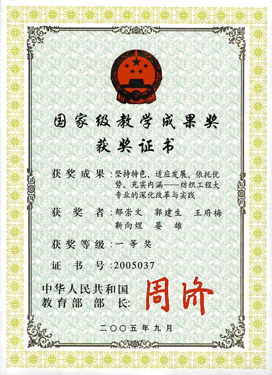 国家级教学成果奖 | "坚持特色、适应发展、依托优势、充实内涵——纺织工程大专业的深化改革与实践" | 2005 | 一等奖 | 郁崇文、郭建生、王府梅、靳向煜、晏雄 |