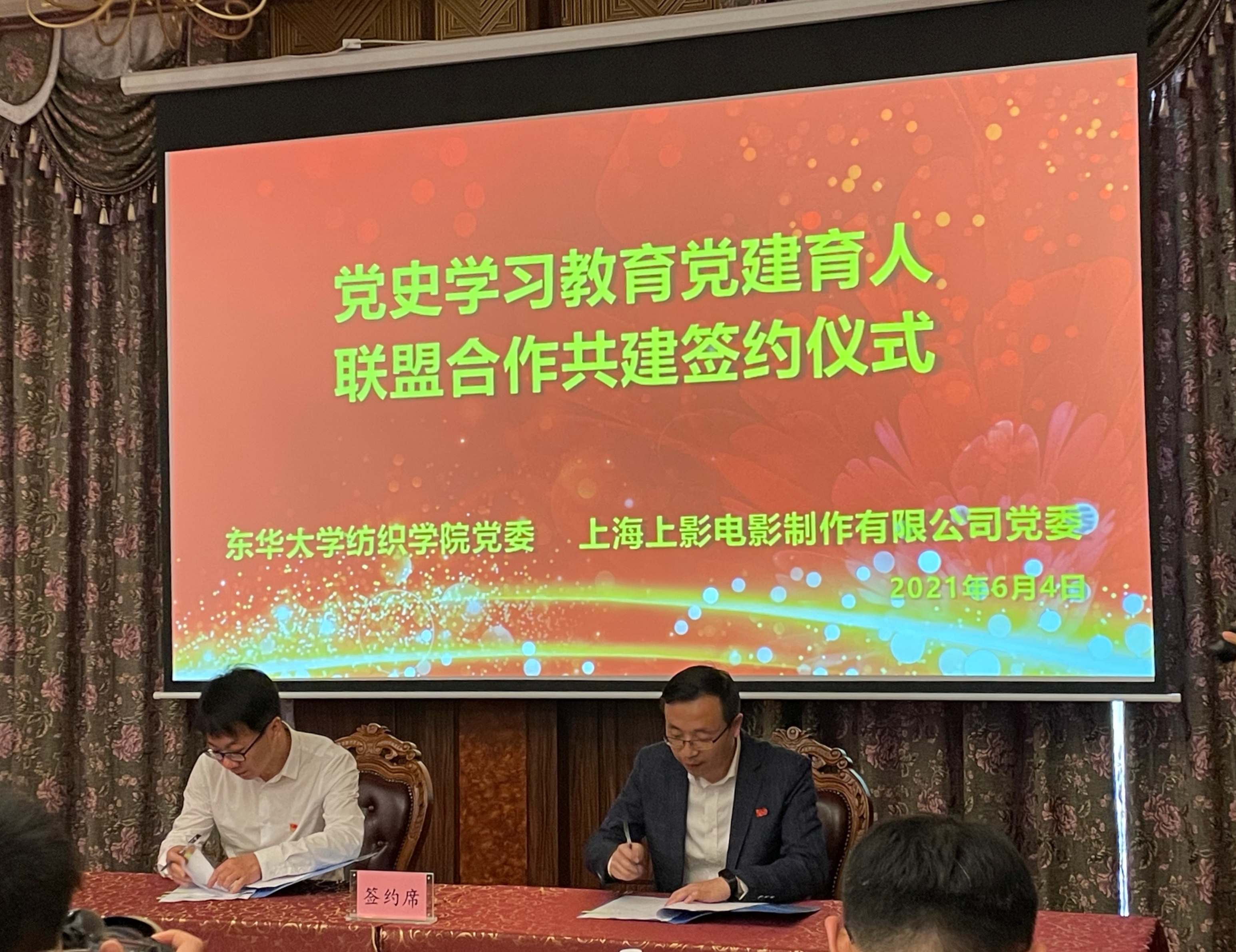 纺织公司党委书记李成龙与上海上影电影制作公司党委书记张乐平就党史学习教育党建育人联盟合作共建协议和老员工志愿服务共建协议进行现场签约。双方表示,将本着“资源共享、优势互补、注重实效”的原则,围绕建党100周年,通过共同夯实组织基础、共同传承红色文化、共同促进改革发展、建立定期联系制度等途径,进一步固本强基、拓展内涵、打造品牌,切实将党建优势转化为基层治理优势和发展动能,实现党的建设与人才培养良性互动,推动“十四五”开新局、谋新篇。