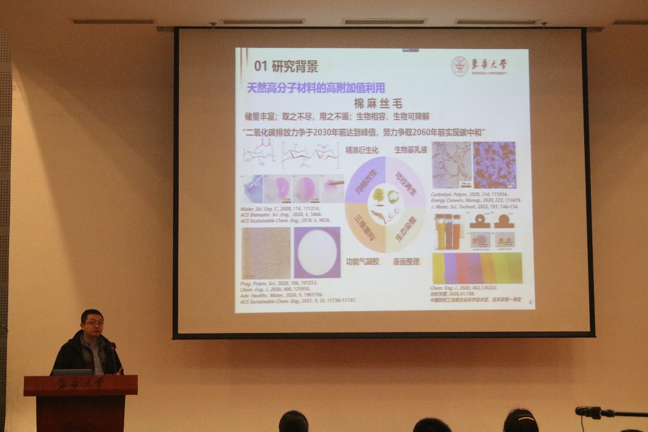隋晓锋和斯阳分别作《天然高分子基功能材料》和《超轻超弹纳米纤维气凝胶的三维构建及功能化应用研究》的主题报告。4位优秀的博士生国家奖学金获得者(何满堂、陈俊丽、蔡亭伟、降帅)分享科研经验。本次学术年会由汇报提问和海报展示两部分组成。孟虎、曹巧丽、黄倩倩、刘凡茜子等26位博士生带来了精彩的课题汇报,内容包括《模特类型对消费者和服装网上零售的影响》、《条混过程的模拟及其工艺参数对混合效果的影响》、《苎麻织物/环氧树脂阻燃复合材料的制备和热学、力学及声振特性研究》等前沿的科研问题。博士生们精彩的汇报引起评委老师和听众的高度关注,纷纷就自己的想法和疑问与汇报同学进行交流。陈硕、陈馨逸、陈跃慧、杜敏芝等30位同学带来了丰富的海报展示,吸引了大批老师和研究生们观摩。