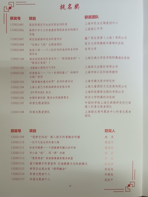 上海科普教育创新奖是上海市首个市级科普类奖项,此次获得提名奖也是公司首次获得该大类奖项,更激励着我们继续做好和推进纺织相关科普工作的信心。在常态化疫情防控中,我们将在公司的领导下,加快推进新型防护材料的科学研究,积极开展相关成果转化,努力实现为国家和医务人员提供更优质的防疫之盾,同时也将认真做好科普知识的传播宣传,携手共筑防御长城。