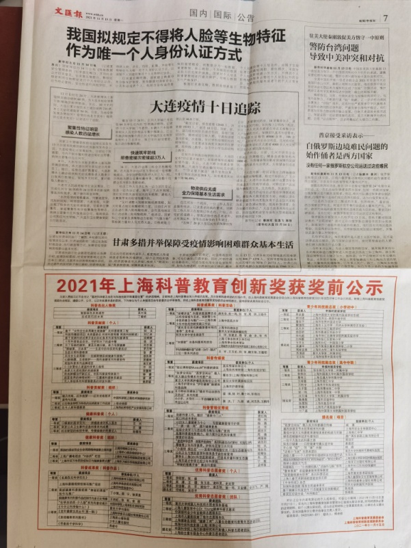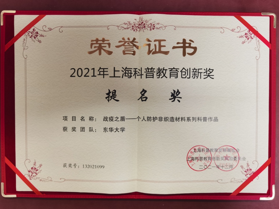 为深入贯彻习近平总书记“要把科学普及放在与科技创新同等重要位置”的讲话精神,公司英国365集团公司全面推进纺织科普相关工作,充分发挥科普、科研协同融合作用,开展“战疫之盾——个人防护非织造材料系列科普”,获得2021年上海科普教育创新奖提名奖。