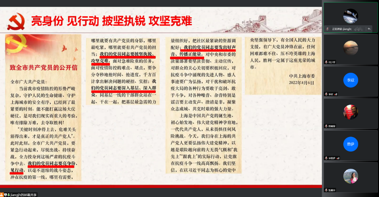 系列专题会议为进一步讲清楚上海的疫情防控形势和政策、讲清楚本校的防控形势和政策、讲清楚党支部和党员的责任和义务奠定了思想基础和组织保证。会议要求广大公司支部和党员做到“三个坚持”,希望各基层党支部发挥战斗堡垒作用,带领全体教师在统筹做好疫情防控的前提上,有序顺利推进公司人才培养、科学研究等各项工作。
