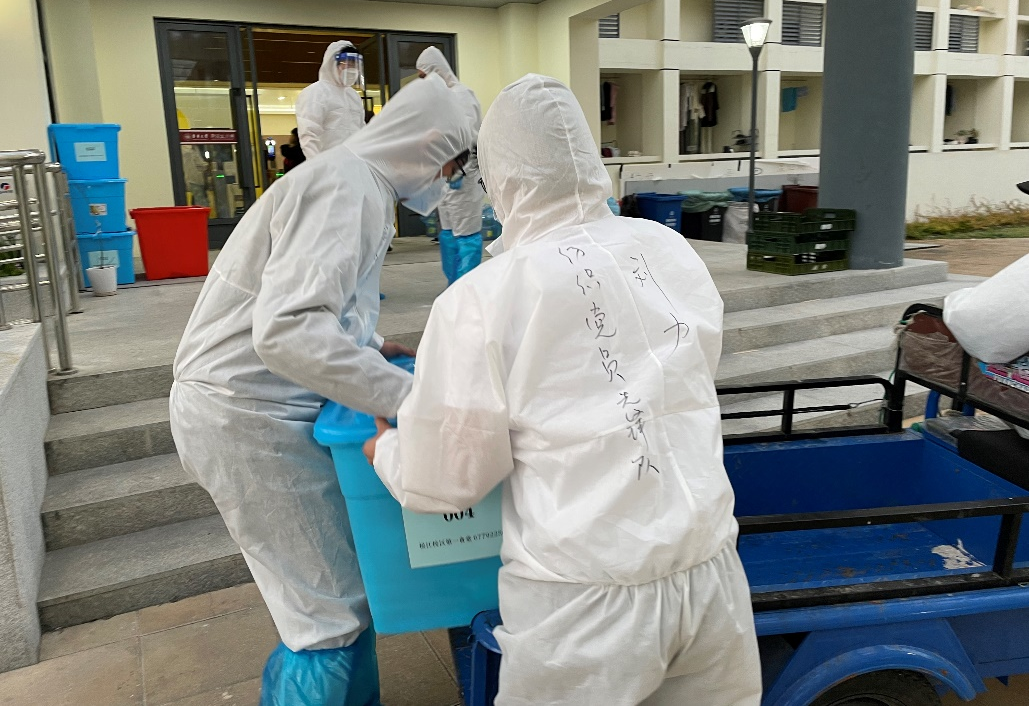 (由教师党员组成的“纺织党员先锋队”正在为松江校区员工送餐)